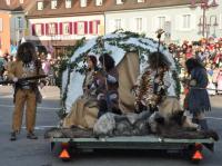 Tanzende große und kleine Räuber/Innen überfielen anschließend den Marktplatz, um dem Kaiser die Schatzkiste zu rauben und die Zuschauer/Innen mit einem Tanz zu begeistern. Das Spektakel hatte sich der Breisacher Damenzunftrat einfallen lasssen. Extrem unsportlich fählte sich sicher so mancher Narr bei der Lara- Croft- Show der Förderriege des TV- Breisach. Und auch die Ägypterinnen von „Tanz und Bwewegung“ riefen rhythmisch ins Bewußtsein, dass man ohne Sport schnell zur Mumie verkommt. Unter der Leitung von Ramona Schmidt zeigten die Brisacher „Kläpperle Buebe“, unter denen übrigens auch Mädchen sind, das ma mit zwei Holzbrettchen klappern und dabei gleichzeitig tanzen kann. Die „Gaukler- Kinder“ zeigten bei ihrer Einradshow „Punker und Rocker“, dass auch junge Narren schon voller Opferbereitschaft zur Sache gehen. Zwei der beteiligten Mädchen radelten mit Gipsarm! Einen Ausflug in den Osten Europas machten die Panduren aus Hochstetten bei ihrer Aufführung „Tanz der Geigen“. Die Guggenmusik „Schädelfätzer“ zeigte zum einen, dass schräg auch schön sein kann und zum anderen, dass man sich bei der Männergugge keine Nachwuchssorgen machen muss. Der Dirigent des Auftritts war nämlich kaum größer als eine Trompete. Klassiker aus dem Kultfilm der 80er Jahre lieferten die „Blues Brothers“ der „Rhiwaldhexen“. Anschließend kämpften die „Brysacher Hofnarren“ erst mit Flatterbändern und dann mit Boxhandschuhen. Allerdings ging so mancher Zuschauer schon beim Anblick des Nummerngirls k. o.! Atemberaubend war der Auftritt des Motorrad- Artisten Mike Auffenberg aus Thüringen, der bereits im vergangenen Jahr gezeigt hatte, wie es aussieht, wen jemand wirklich Motorrad fahren kann. Den Höhepunkt seiner PS- Show bildete der Sprung über ein mit mutigen Hofnarren besetztes Riesenquad. Gefühlt 1000 bunte Clowns bevölkerten anschließend den Platz. Wie es Sabrina Mastrocola gelungen ist, mit der vielköpfigen Rasselbande einen Tanz einzustudieren, bleibt ihr Geheimnis. Allein das Nähen der Kostüme muss Jahre gedauert haben. Der langen Tradition der Fasnacht in Breisach war das Narrennest „Algerio“ auf die Spur gekommen. In einer Steinzeithöhle hatten sie mit Hilfe von Stadtarchivar Uwe Fahrer den Urnarren entdeckt.