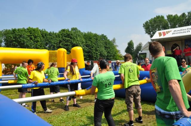 Bei bestem Rasensportwetter hatten sich am 29. 5. auf dem Sportgelände des BWK insgesamt 16 Narrenzünfte aus Breisach aber auch aus der näheren und ferneren Umgebung zusammengefunden, um „Narrenweltmeister“ im Tischfußball zu werden. Dabei handelte es sich jedoch nicht um ein gewöhnliches Kickerturnier, sondern die „närrische“ Variante der Kneipensportart. Statt Figürchen an einer Drehstange zu bewegen, verwandelten sich die Teilnehmer/Innen selbst in Kicker und trugen den Wettkampf an Gummistangen geklettet auf einem entsprechend großen luftgepolsterten Spielfeld aus. Nach dem Motto „Ein Spiel hat 5 Minuten“ traten die Narrenzünfte gegeneinander an, bis gegen 17 Uhr 30 im Finalspiel die „Weltmeister“ ermittelt werden konnten. Neben den Spielen sollte aber auch das leibliche Wohl nicht zu kurz kommen. Rund um das Spielfeld waren für Sportler wie Fans Versorgungsstände aufgebaut, die auch reichlich frequentiert wurden.