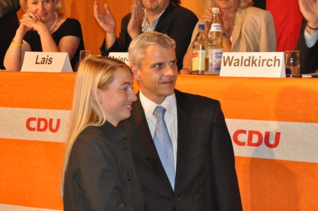 Dr. Patrick Rapp, erst im Februar des vergangenen Jahres zum neuen Kreisvorsitzenden bestimmt, wirkte fast ein wenig matt angesichts der Rede der Powerfrau aus Bad Krozingen. Allerdings musste ihm auch der alphabetisch bedingte undankbare zweite Rednerplatz zu gute gehalten werden, da er keine neuen Themen erfinden, sondern nur die von Sabine Pfefferle bereits genannten nochmals aufgreifen konnte. Auch seine Schwerpunkte lagen bei den Themen Bildung, Förderung der Wirtschaft insbesondere des Mittelstandes, Infrastrukturmaßnahmen, Landwirtschaft und vernünftiger Atomausstieg. Ebenso standen bei ihm die Forderung nach einem menschenverträglichen Ausbau der Rheintalbahn sowie naturverträglicher Hochwasserschutz auf dem Redeprogramm. Zum Thema Landwirtschaft betonte er insbesondere die Unsinnigkeit der EU- Weinreform, bundespolitisch störte er sich an den Ungerechtigkeiten des Länderfinanzausgleichs. Als seine besonderen Merkmale unterstrich der 41jährige promovierte Forstwirt, der seit 1985 in der CDU aktiv ist, Konfliktbereitschaft, Geduld, Geschick, Beharrlichkeit und ein großes Maß an Diplomatie. „Politik“, fasste Rapp seine Rede zusammen, „sei ein Mannschaftssport“ und sein Ziel „Arbeit mit und für die Menschen“.