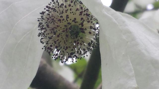 Natur-Wunder: Der Blütenkopf der „Davidia involucrata“ mit den weißen Brakteen.