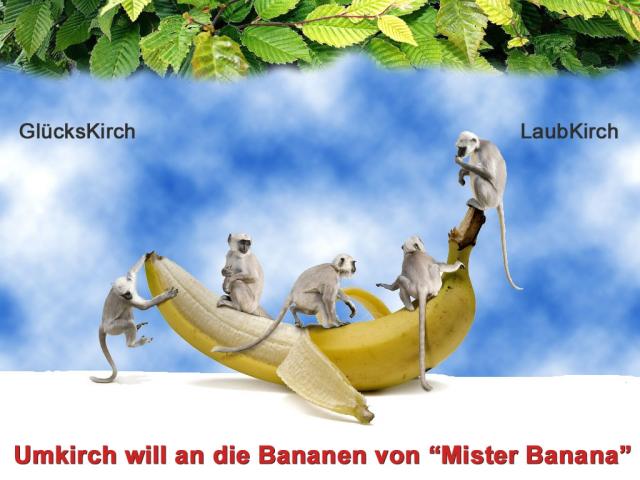 Bananen-Dorf Umkirch? Umkirch „reitet“ künftig wahrlich auf Bananen. Und will damit, und mit Obst, Gemüse und Südfrüchten, Gewerbesteuer kassieren. Bei der Merkur-Frucht GmbH. Der größte Obst-, und Gemüsehändler im Südwesten kommt mit seinem Betrieb, und einer riesigen Bananen-Reiferei, nach Umkirch. Am Mittwoch, den 22. September 2010, um 14h00 Uhr, war Spatenstich. Handelsherr Michael Hordzewitz hat es in Rekord-Zeit geschafft, die erforderlichen Bau-Genehmigungen zu erhalten. Und das liegt, sagen viele, an den „Bananen“. Denn mit Hordzewitz, und seinen Bananen, wollen alle verdienen. Deswegen rollten sie für Chef von Merkur-Frucht schnell und gern den roten Willkommens-Teppich aus. Denn es lockt die saftige Gewerbesteuer eines tüchtigen und erfolgreichen Unternehmers. Alle wollen an die Bananen? Genauer gesagt: An den Gewinn damit. Zuerst „verdienten“ jedoch einmal die katholische Kirche und das Fürstenhaus Hohenzollern. Sie wurden Spekulations-Gewinner durch die jetzt genehmigten Nutzungsänderungen: Aus ihren nicht bebaubaren Waldstücken machten die beiden zusammen rund eine Million EURO. Während sie sonst auf einem ertragsschwachen Waldstück sitzen geblieben wären, brachte ihnen die Umwandlung des Waldes in Bauland „Schwubs di Wubs“ das etwa 30-fache des bisherigen Grundstückswertes. Die katholische Kirche will das Geld ihren Mitgliedern wieder zugute kommen lassen: Sie renoviert derzeit damit ihre wertvolle Dorf-Kirche; die älteste Kirche des Breisgaus. Wohin das schwäbische Hohenzollern-Haus ihren „Spekulations-Gewinn“ aus dem Verkauf der (von der früheren Badischen Großherzogin) geerbten Grundstücken steckt, ist nicht bekannt. Doch eine Investition im Umkircher Schloss wäre wohl dringend einmal notwendig. Ein gutes Geschäft machte auch die Gemeinde, denn sie bekommt von Hordzewitz die vom Naturschutz vorgeschriebene „Ausgleichsfläche“ aufgeforstet, bezahlt und geschenkt.. Bürgermeister Laub war bei diesem Deal durchaus ein tüchtiger Schwabe. Und nun hofft ganz Umkirch auf die künftige Gewerbesteuer; aus den bekannt guten Geschäften von Merkur-Frucht. In den letzten Wochen gab es zwar einigen Wirbel um einige „weniger rentable“ und viel Steuergeld auffressende Projekte in Umkirch: Manchmal hörte man bei den emotionalen Kommentaren und freien Meinungen der Bürger den Satz: „Wir sind doch hier keine Bananen-Republik“. Natürlich lebt Umkirch nicht in einer Bananen-Republik; doch ist Umkirch auf dem Weg zum „Bananen-Dorf„? . Mit den echten Bananen von „Mister Banana“ und den begehrten Handelsprodukten von Merkur-Frucht-Eigentümer Michael Hordzwitz? Also auf zum Spatenstich bei „Mister Banana“, wie ihn Umkirch liebevoll nennt ! Damit der tüchtige Handels-Herr bald arbeiten und schuften kann, um viele Menschen zu beschäftigen und von seinen Gewinnen und seinen Steuern alle profitieren zu lassen. Autor: Werner Semmler
