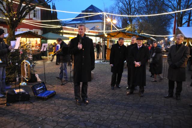 „Der große Weihnachtsmarkt“, so Bürgermeister Oliver Rein in seiner kleinen Ansprache, "macht in diesem Jahr eine Verschnaufpause.“ Für den „Kleinen Weihnachtsmarkt“, der mit seinen 15 Ständen bereits zum sechsten Mal die Zeit bis zum Heilig Abend etwas bunter gestalteten wird, bedankte sich Rein bei den Organisatoren, den Diodones, für das Ausrichten „dieses Kristallationspunktes“. Auch  einem lokalen Energieversorger dankte der Bürgermeister für die stimmungsvolle Beleuchtung samt „weihnachtlicher Adventssterne“.